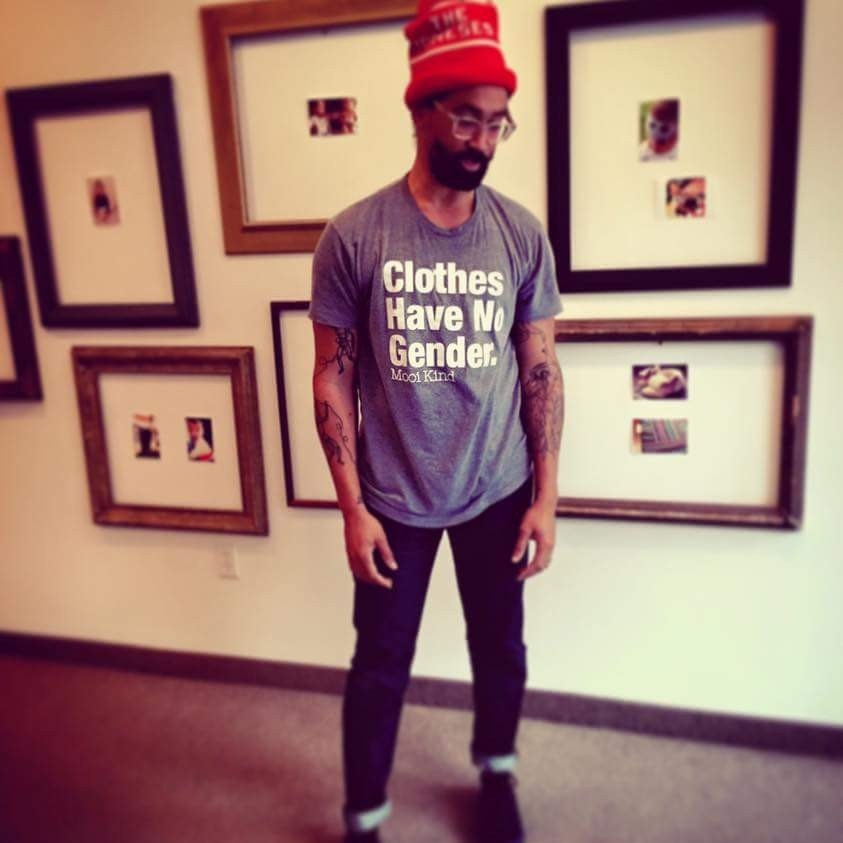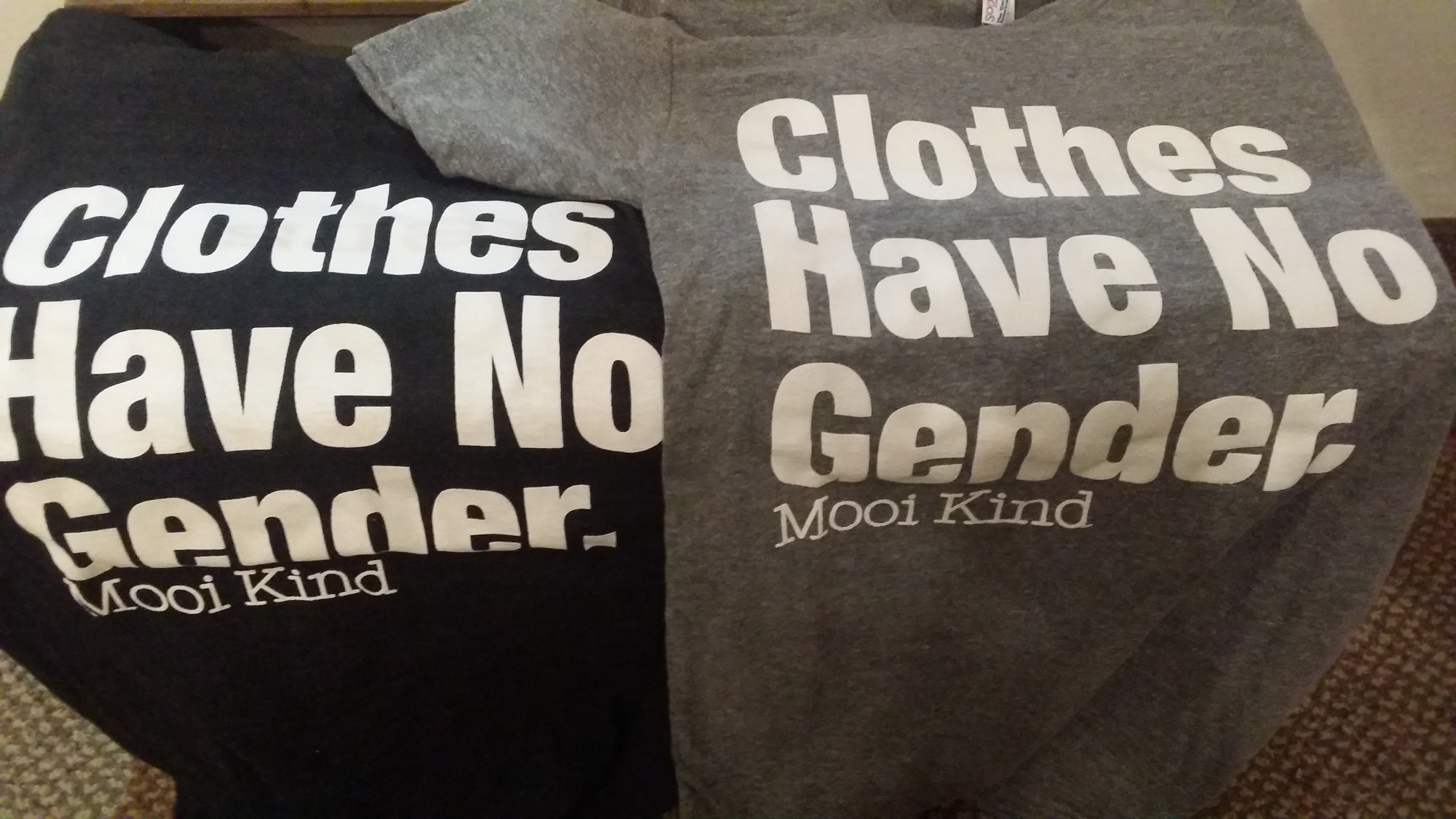 Our standard print T available in heathered black or heathered grey. "Clothes Have No Gender" prominently displayed on the chest of the tri-blend cotton shirt (in adult sizes).
