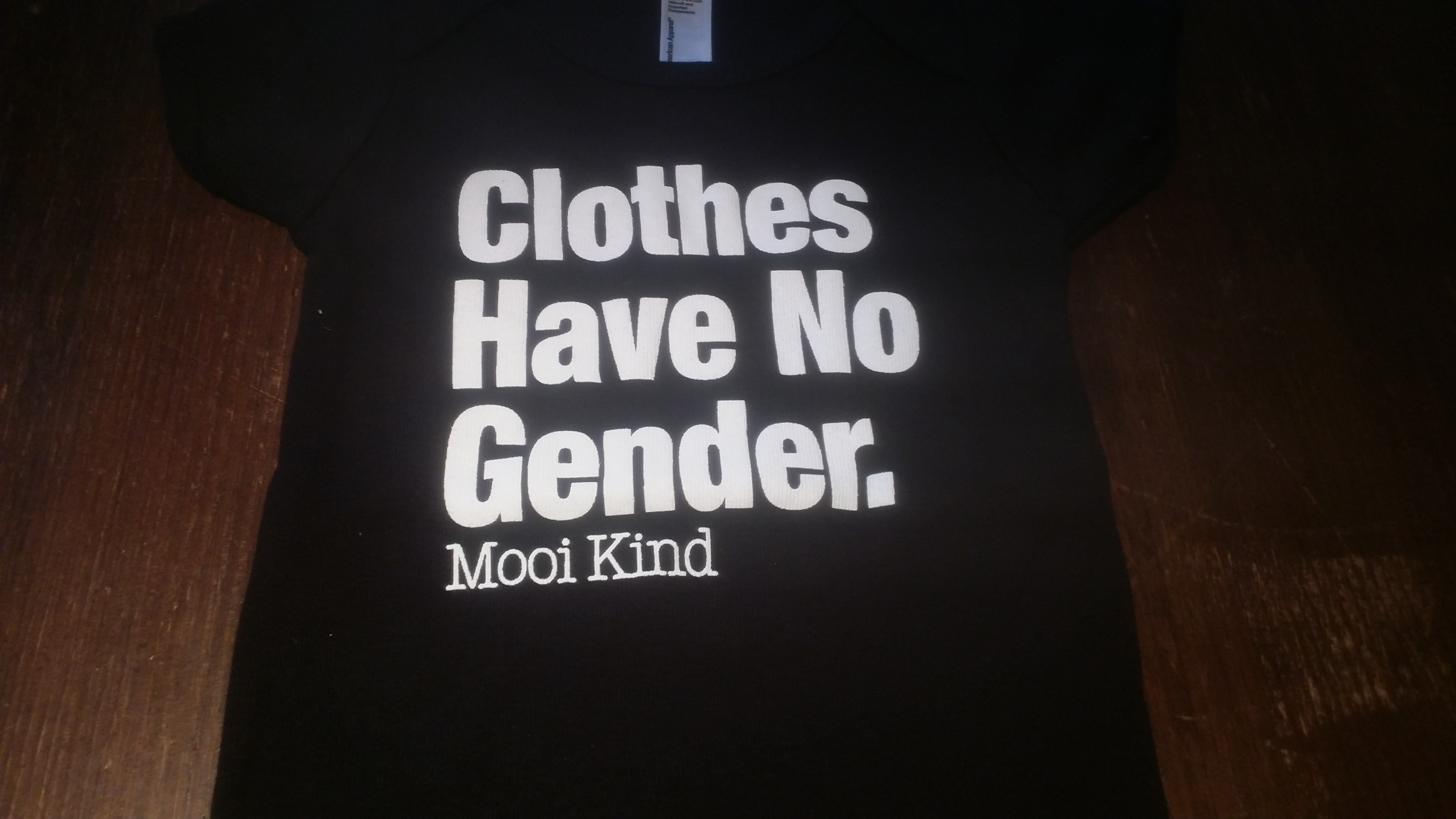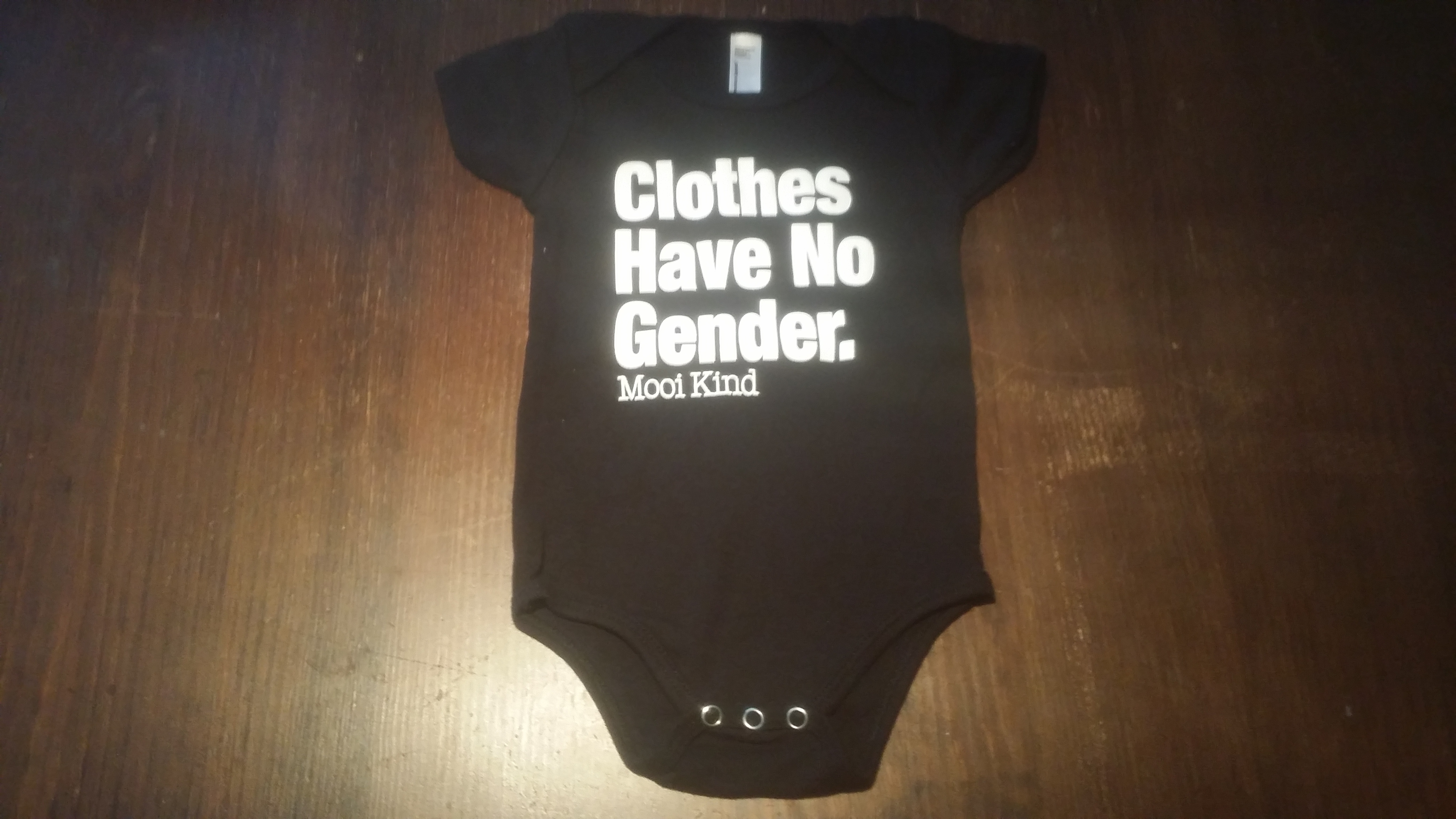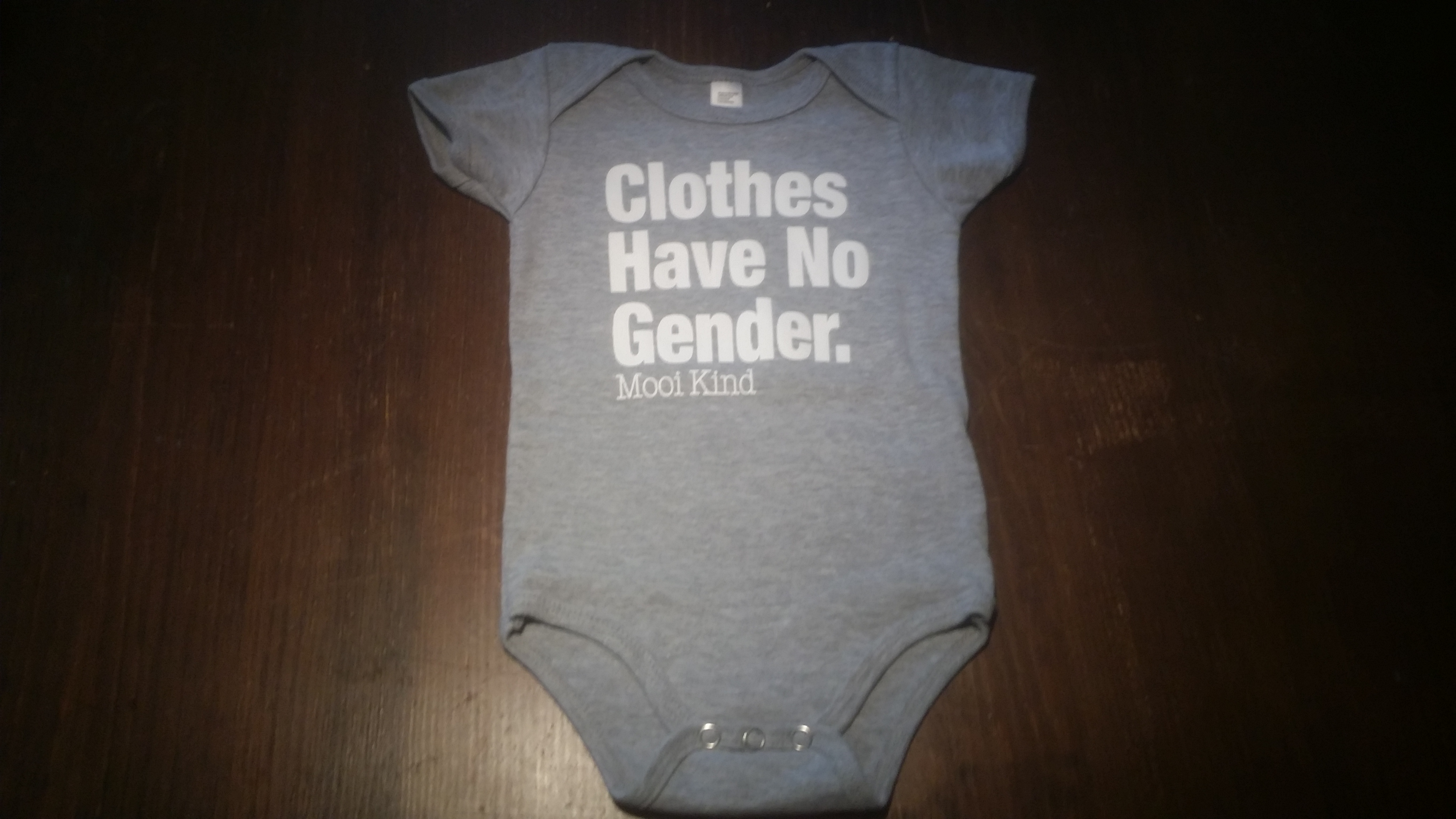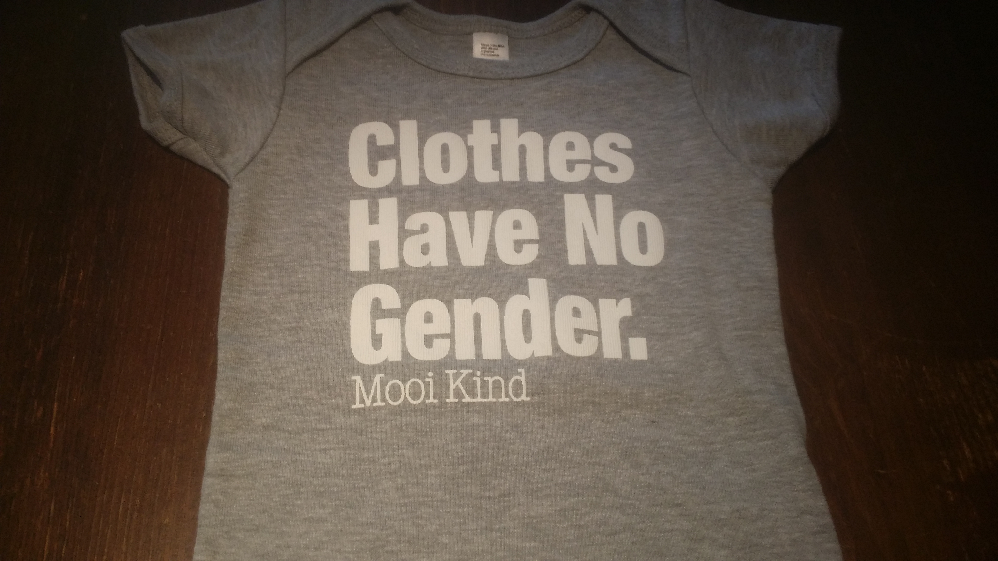 Our standard print onesie available in black or heathered grey. "Clothes Have No Gender" prominently displayed on the chest of the tri-blend cotton onesie (in infant sizes).