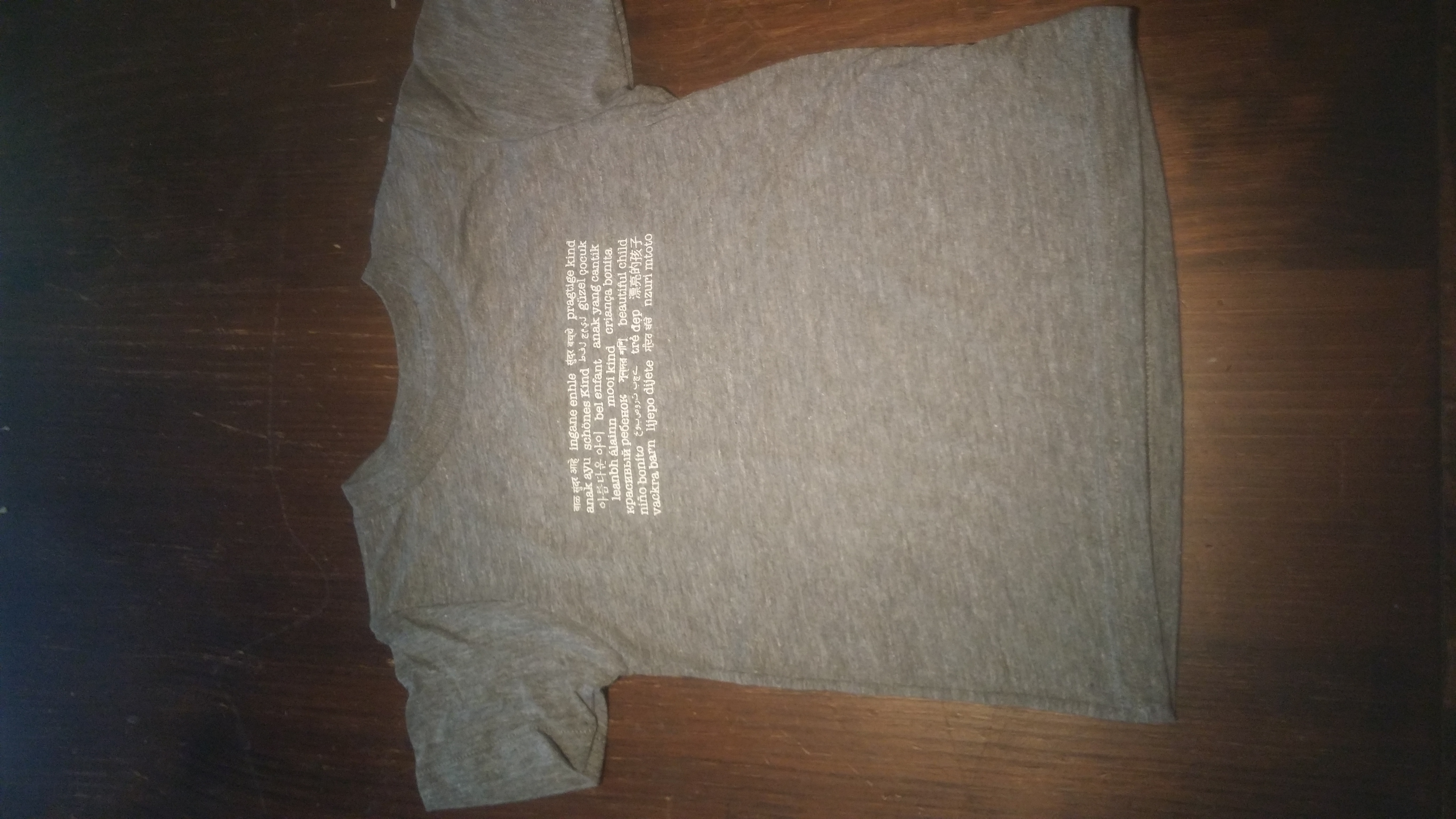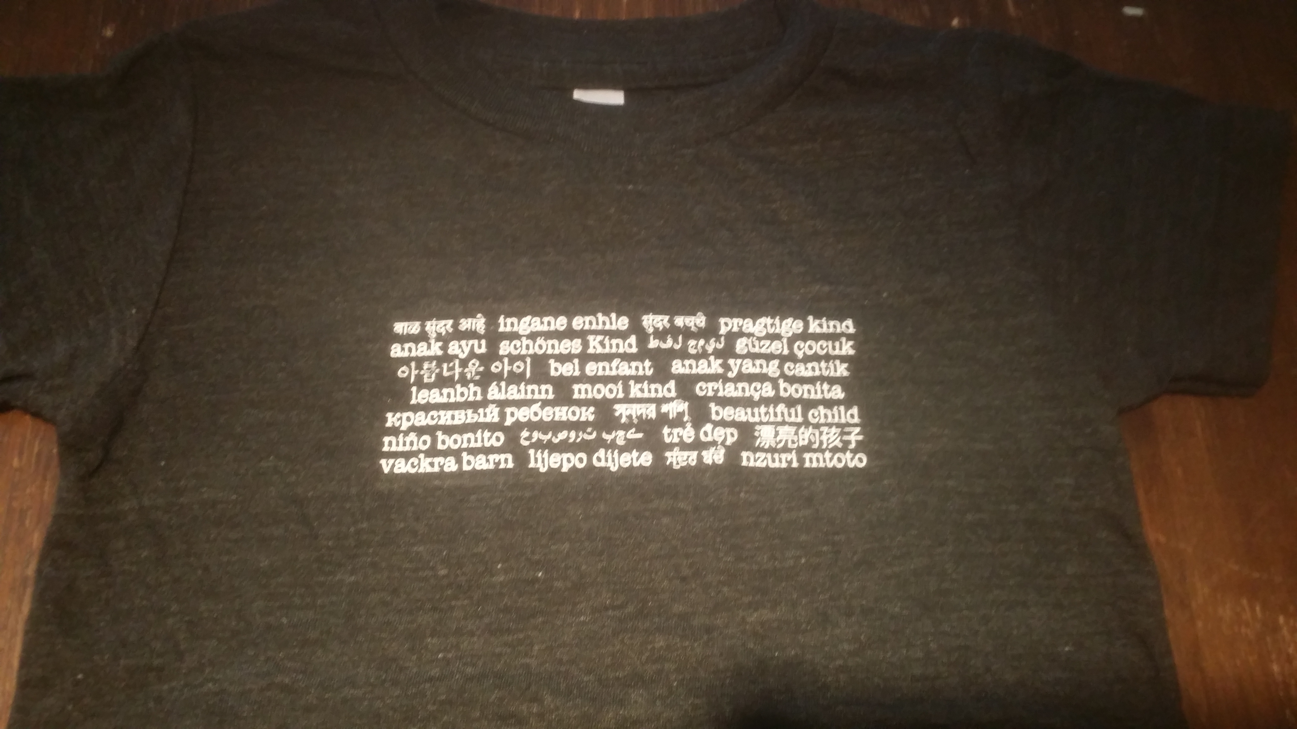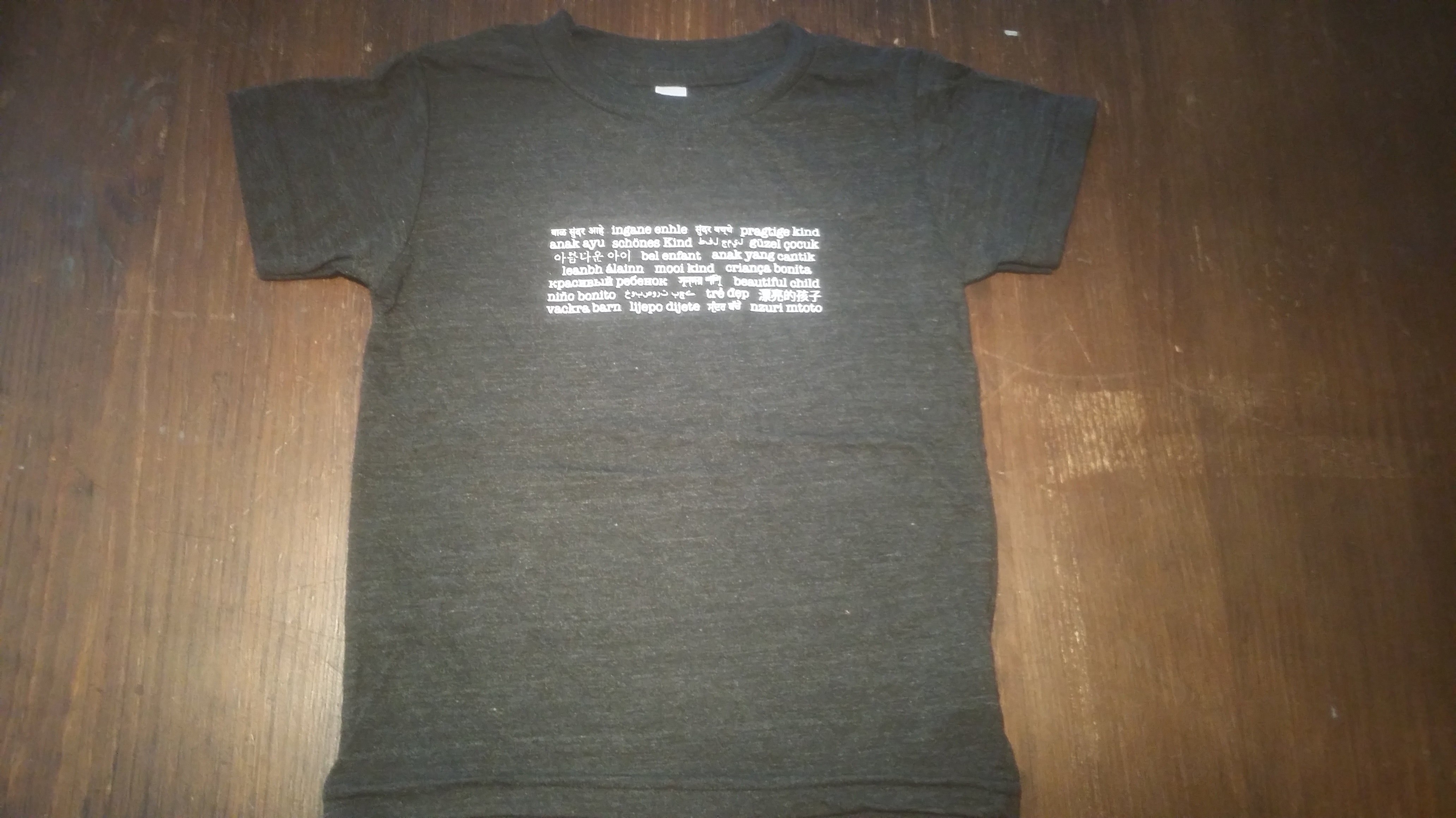 Tri-blend T printed with 'beautiful child' printed in 25 different languages. Available in Athletic Black or Heather Grey.