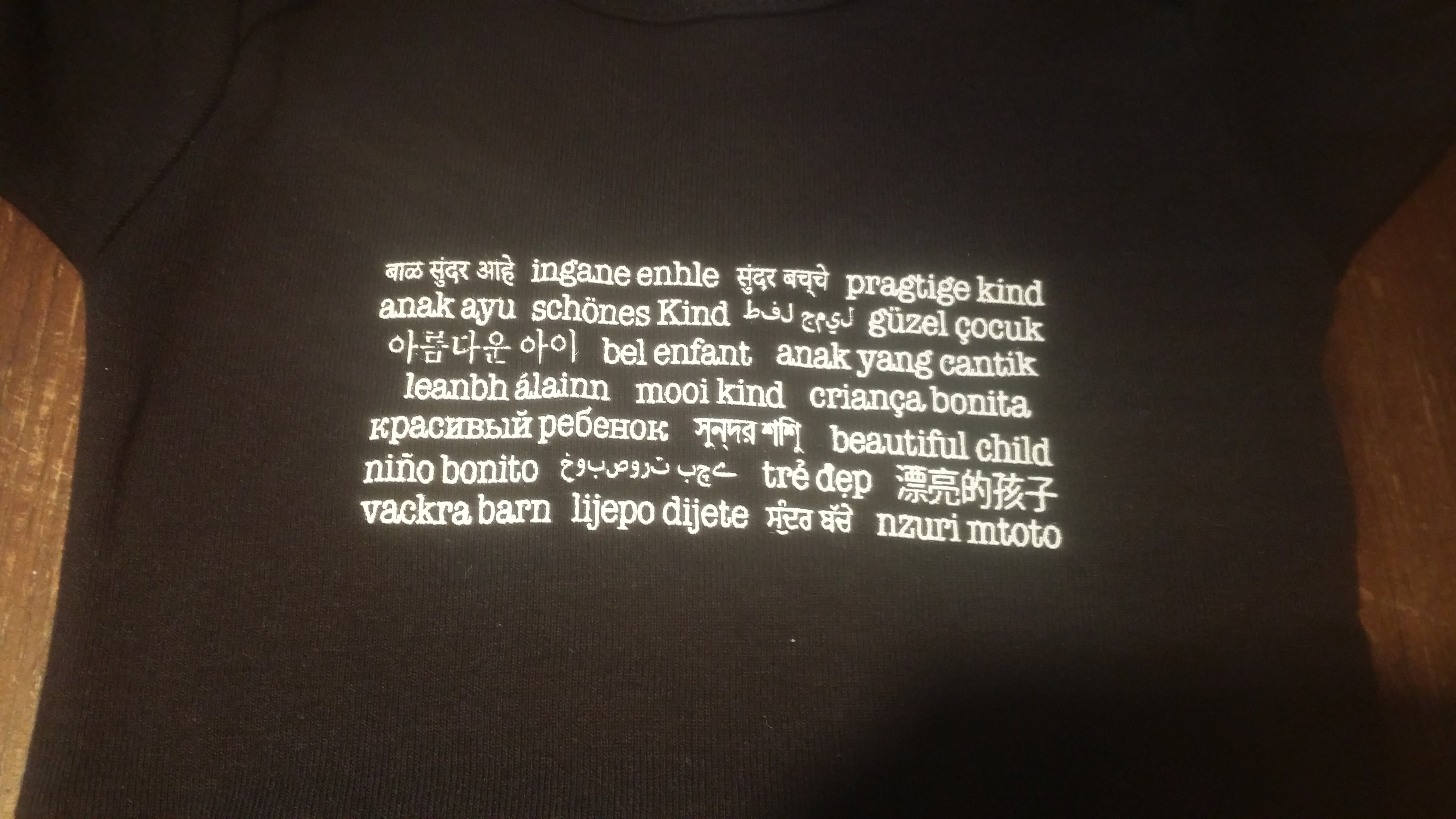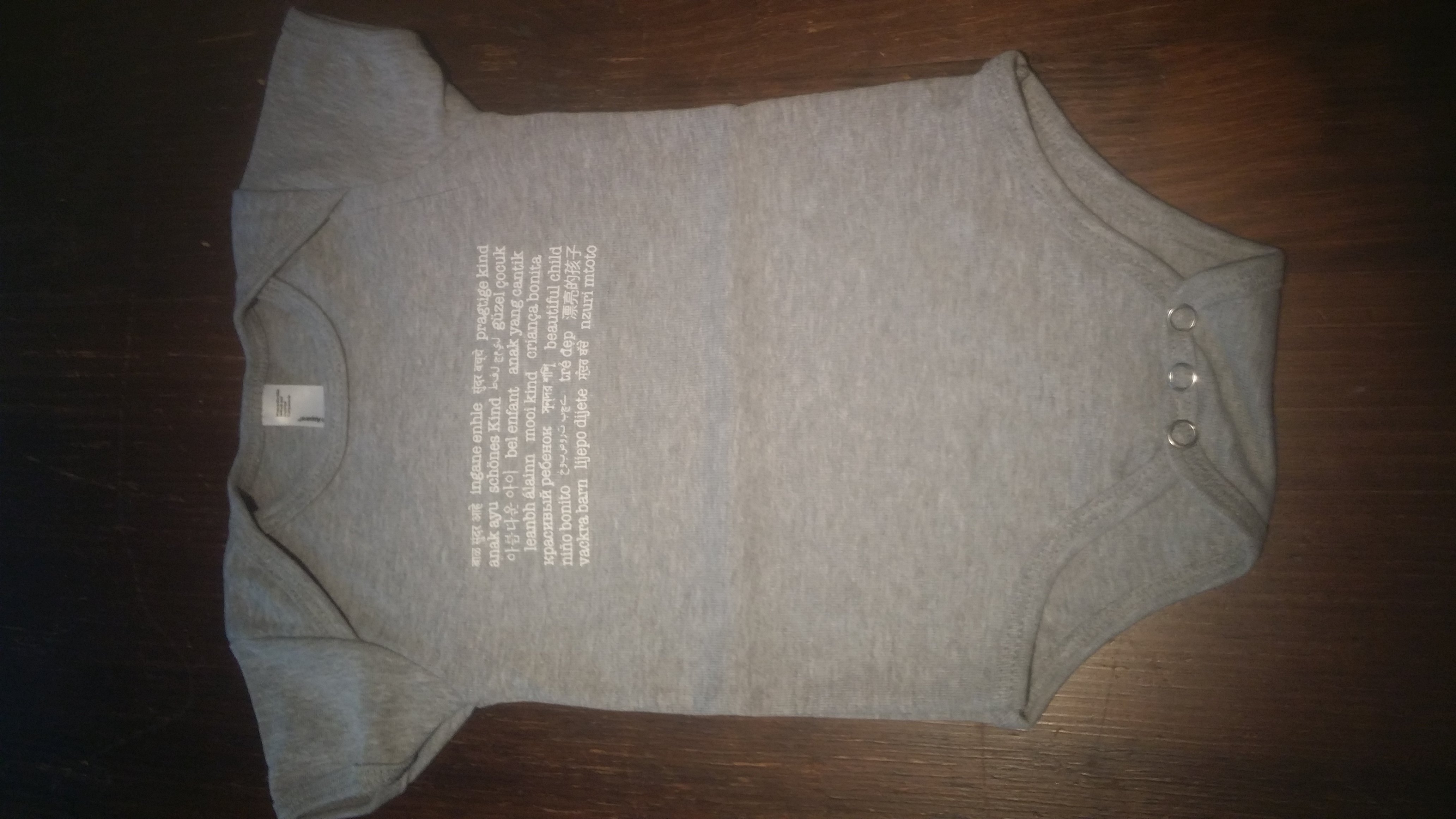 Cotton Onesie printed with 'beautiful child' printed in 25 different languages. Available in Athletic Black or Heather Grey.