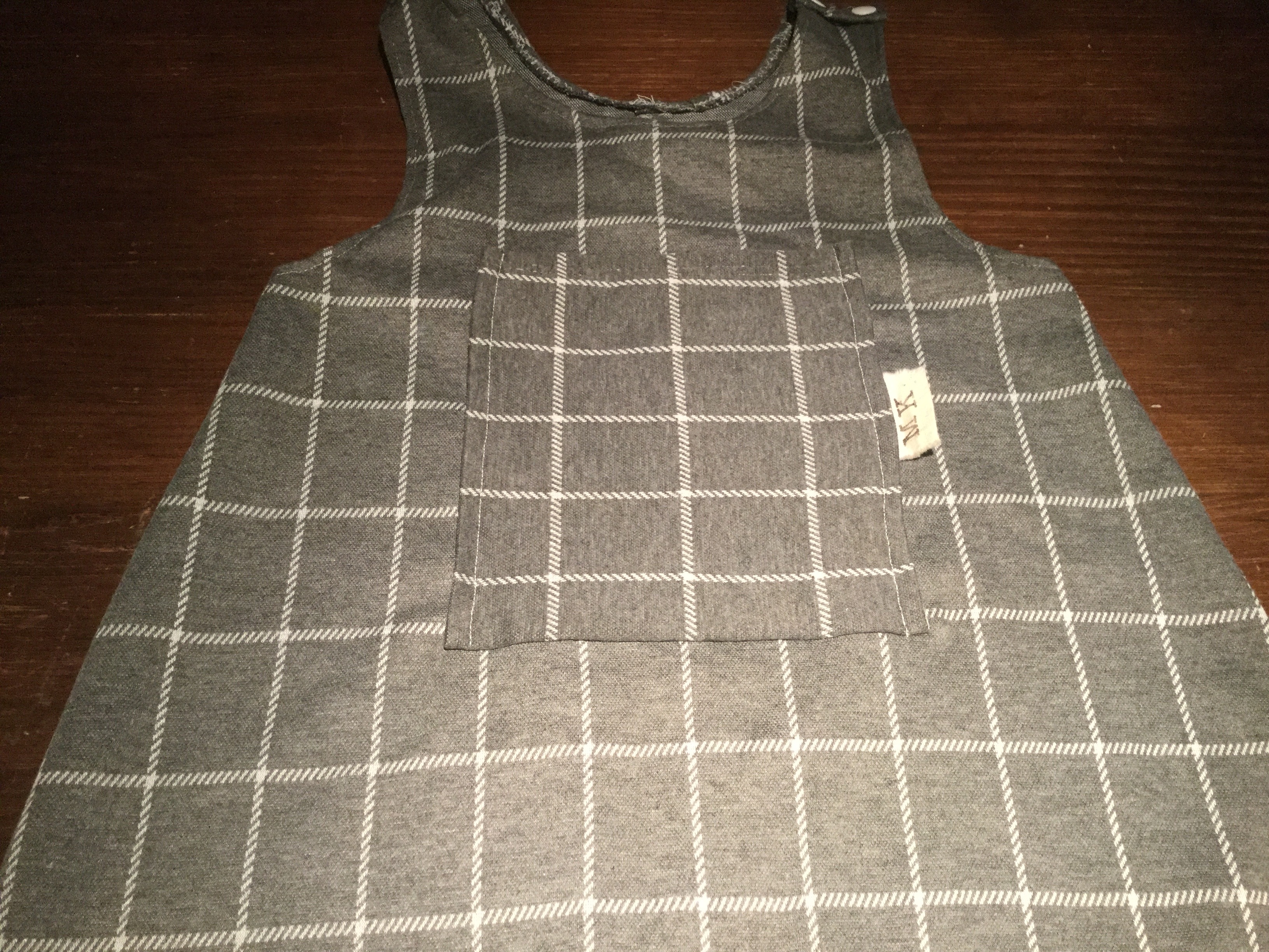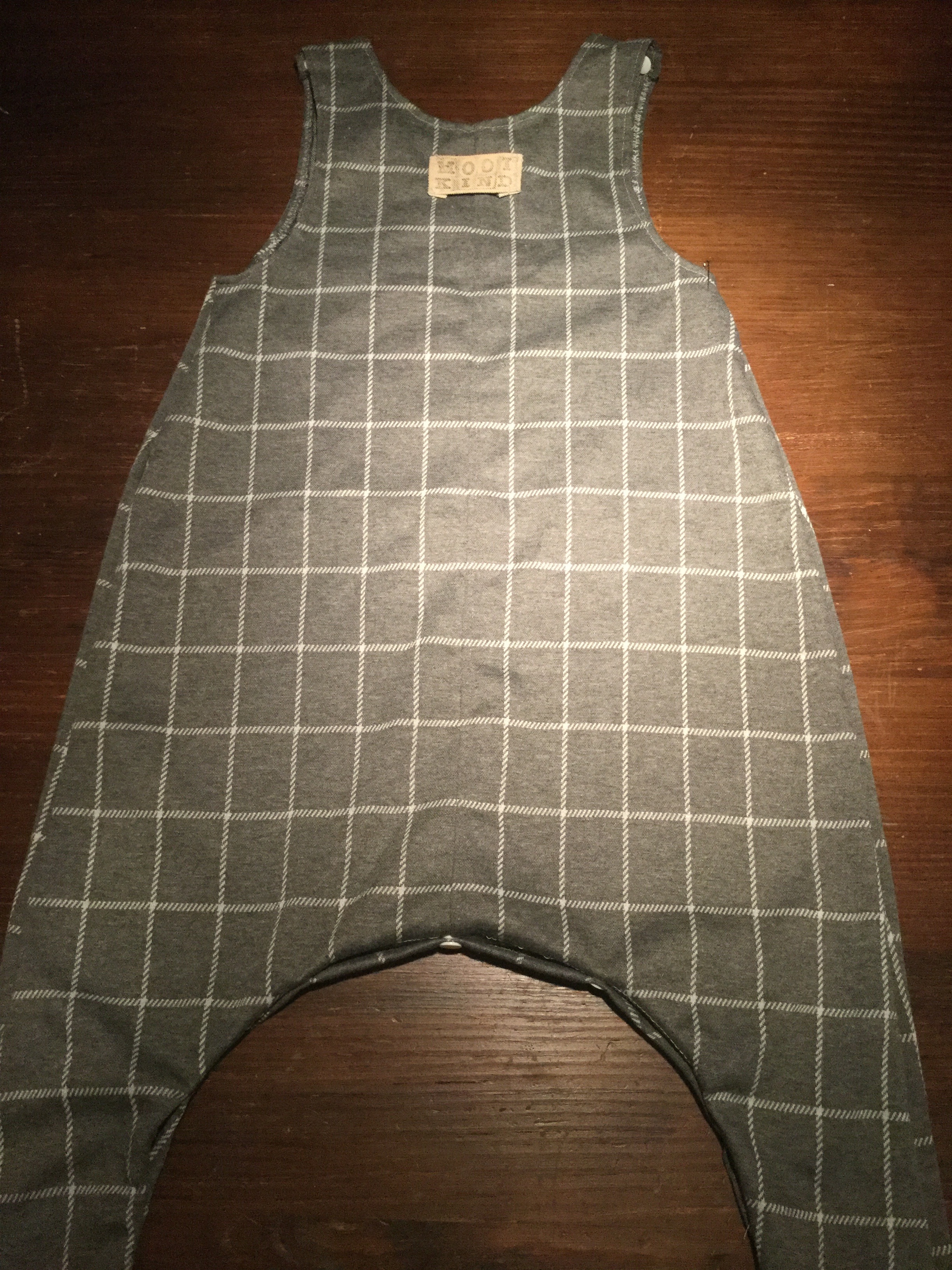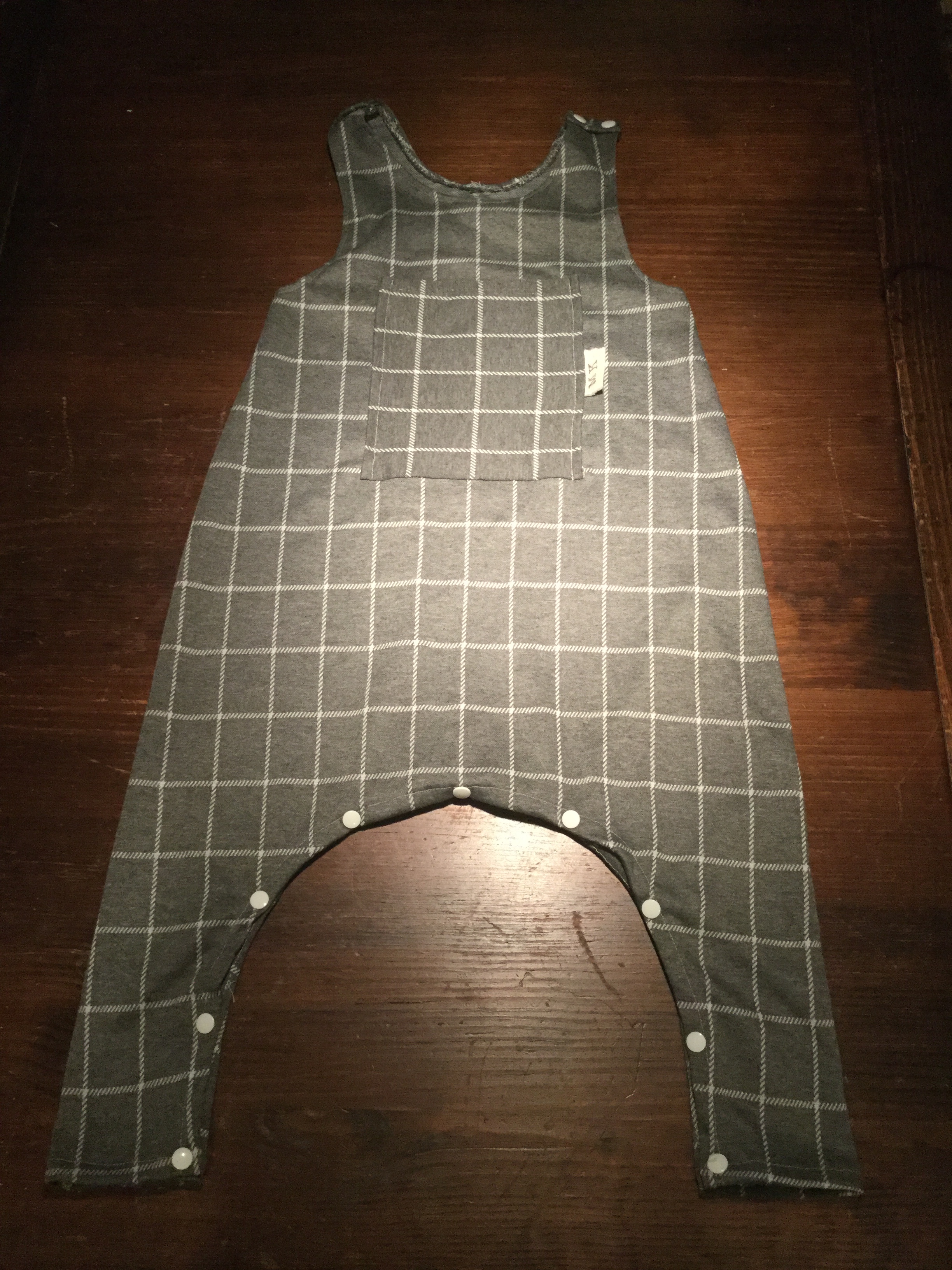 Grey windowpane cotton/wool blend fabric romper. Comfy and oversized to grow with your moving little one. Available with snaps, for easy diaper changes, or without, for the larger kids.