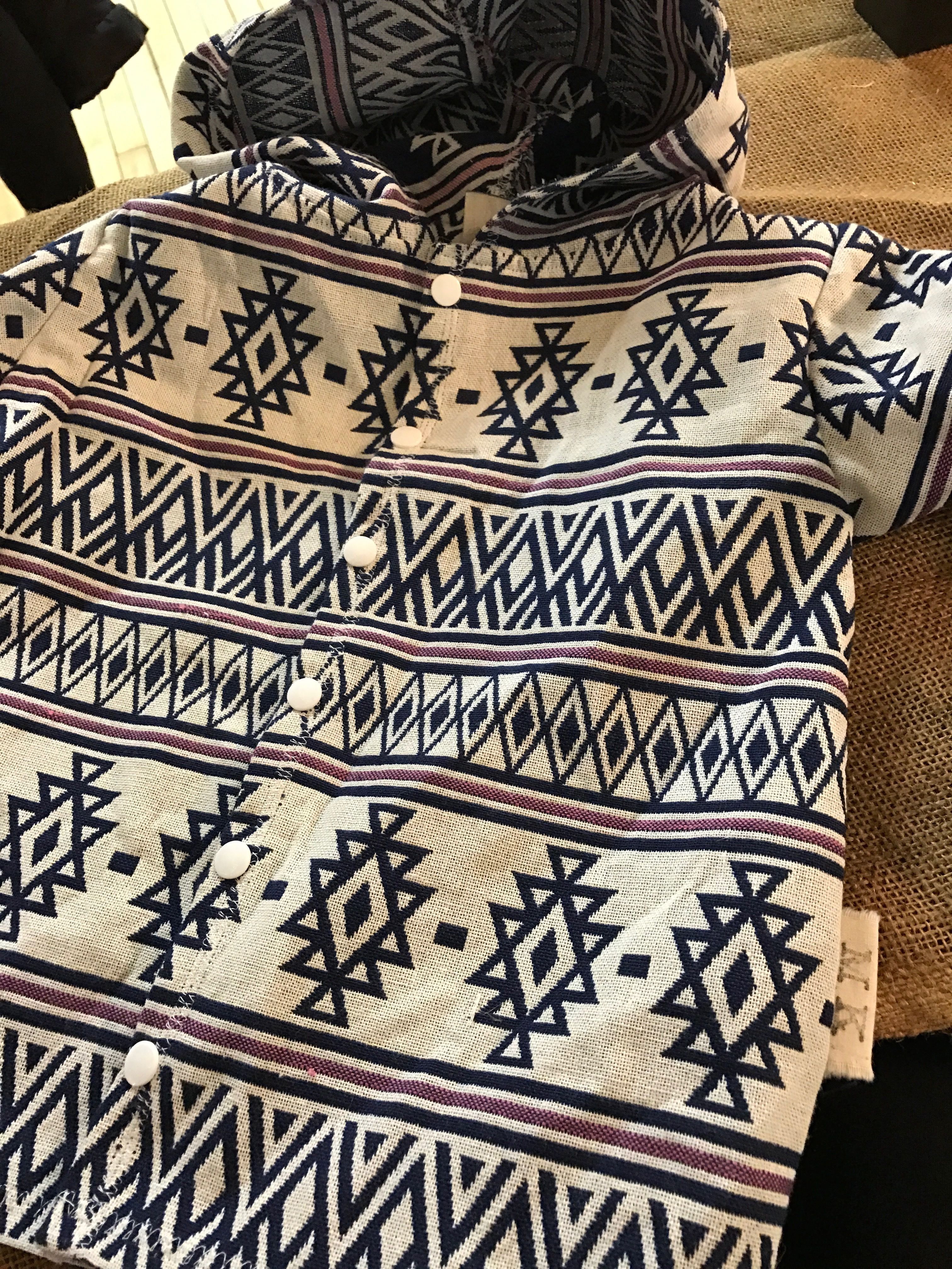 Our classic hooded car coat is now available in a woven geometric print. Complete with white snap closure.