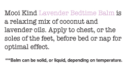 Mooi Kind Lavender Bedtime Balm is a relaxing mix of coconut and lavender oils. Apply to chest, or the soles of the feet, before bed or nap for