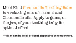 Mooi Kind Chamomile Teething Balm is a relaxing mix of coconut and Chamomile oils. Apply to gums, or the jaw, of your teething baby for optimal effect. In BPA free reusable plastic jar.