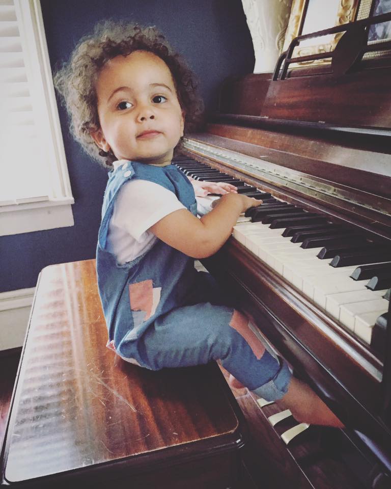 Blue chambray romper with pink and natural white patches. Comfy and oversized to grow with your moving little one.