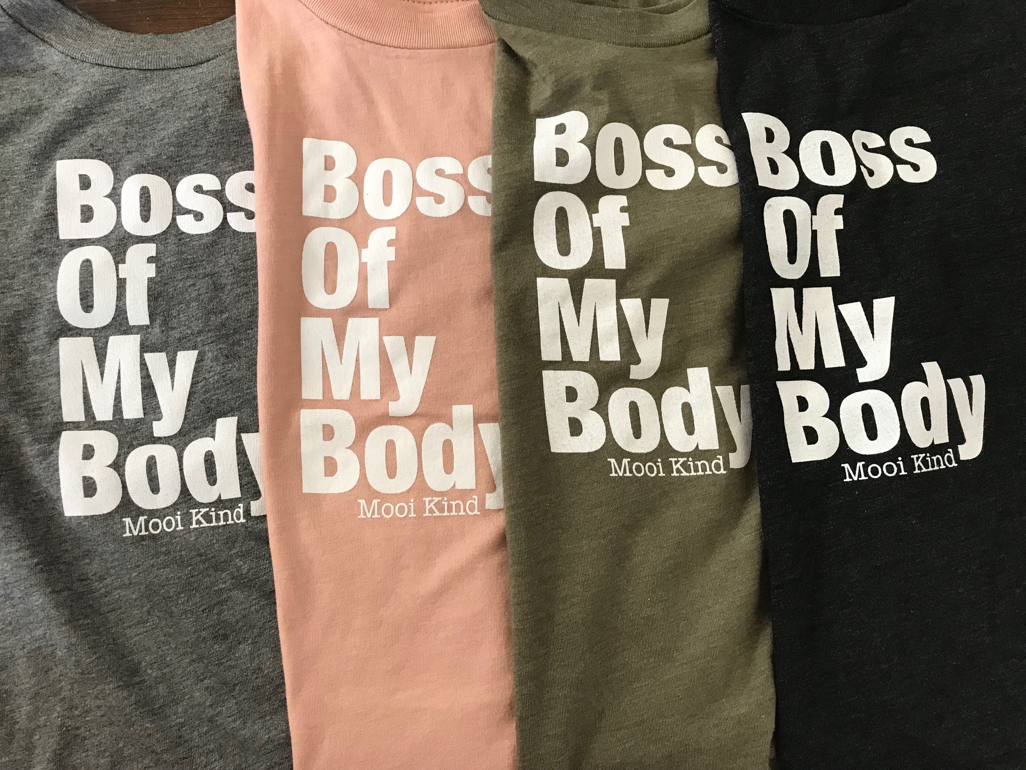 Printed on soft tri-blend cotton, our "Boss of My Body" t-shirts are an empowering message.